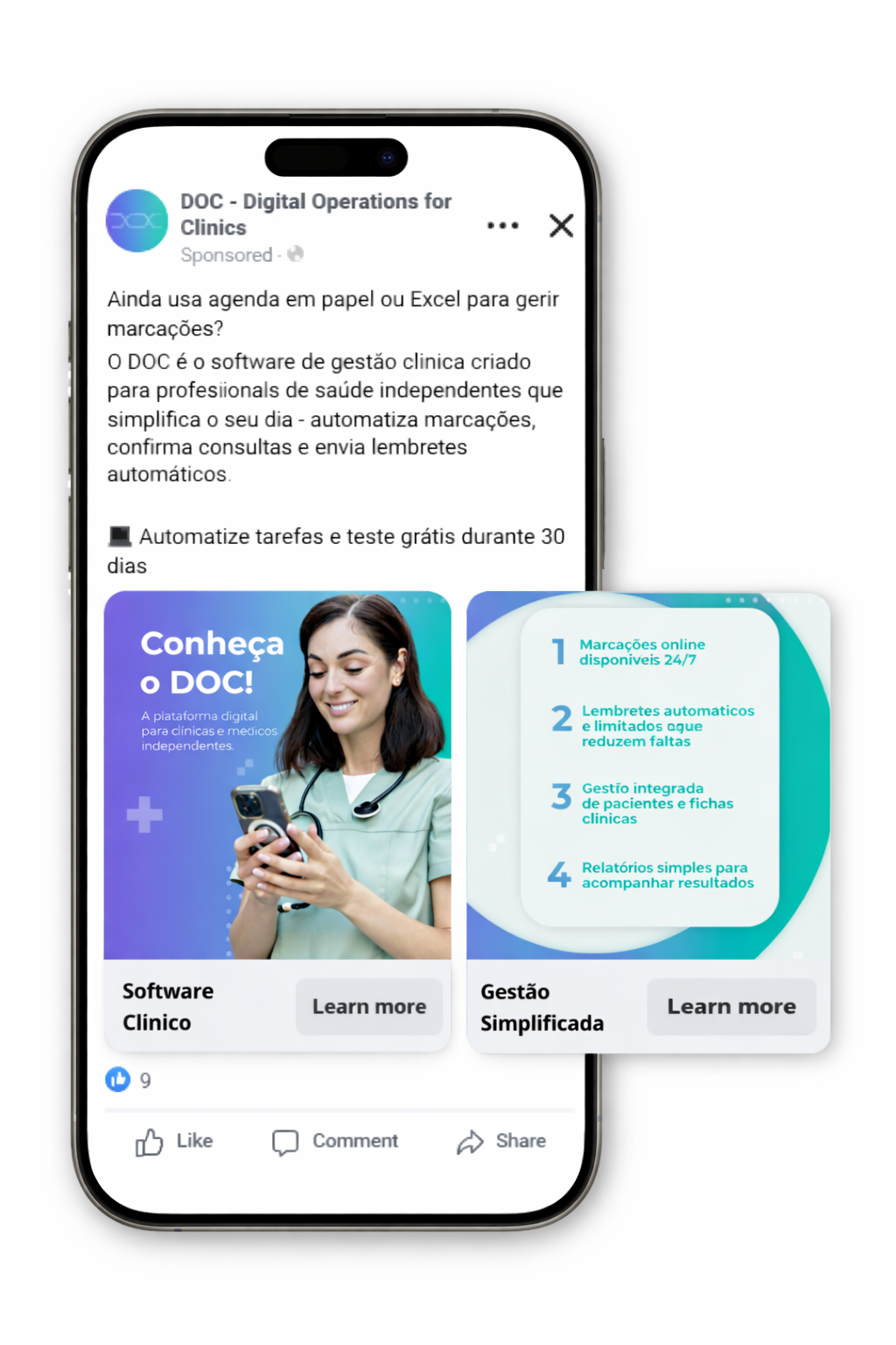An integrated digital strategy was defined and executed, combining online advertising, social media, and content production. Meta Ads campaigns were used to generate awareness and leads at scale, while Google Ads (Search and Performance Max) allowed capturing users with active search intent for medical management solutions.